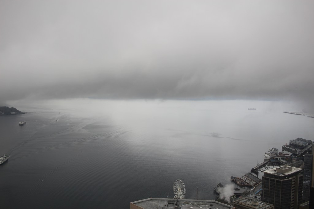 Here, an amazing view from high up my downtown Seattle metropolis, with a mix of dark and lights cloud tones, as peek sunshine and light rain dance slowly about. Meanwhile, the vastness of Elliot Bay provides a smooth, peaceful surface. The Olympic Mountains are beyond, hidden not quite ready to share the scene. I appreciate the moment in short, observing that trancing beauty echoed into future otherworldly inspiration.