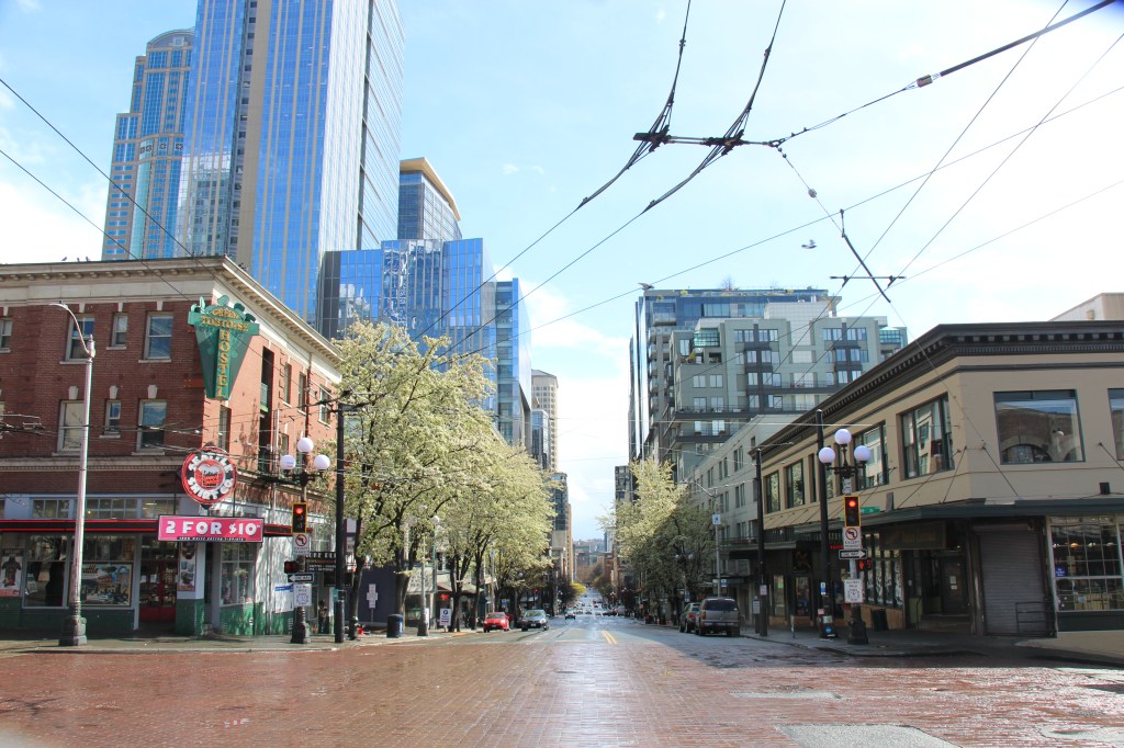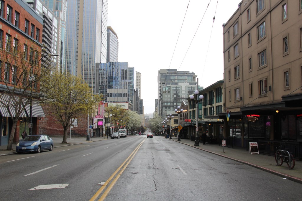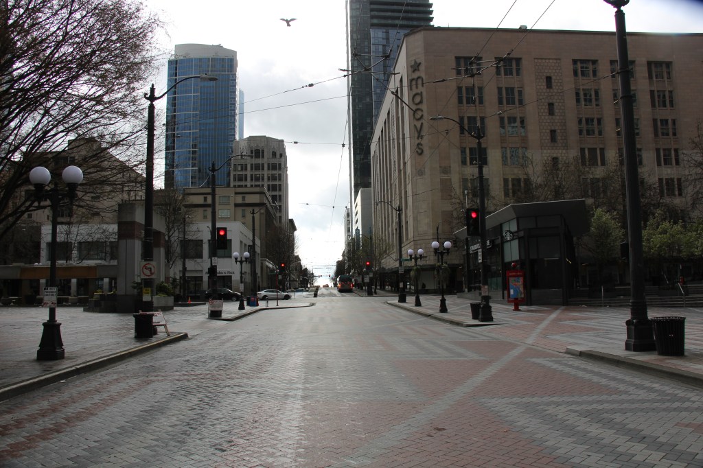 After errands in these shutdown weeks, I often take a small detour through Freeway Park in Downtown Seattle (located above Interstate 5).